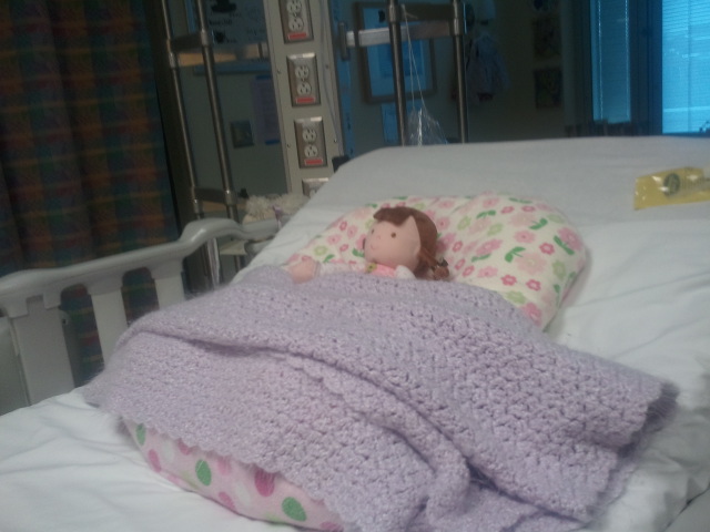 Then the same nice nurse that did Annabelle’s nails was sweet enough to allow Annabelle some Mommy holdy time. So Mommy and Annabelle snuggled for a good 45 minutes. It would have been longer except Annabelle decided to release all the poop she’d been holding up for the last 2 days (they’d been threatening to use a supposotory to clean her out, she didn’t like that so did the job herself.) So, we had a nice fun diaper change in Mommy’s lap. (Dolly also had a nice time in Annabelle’s crib, enjoying some time in the bed by herself!)