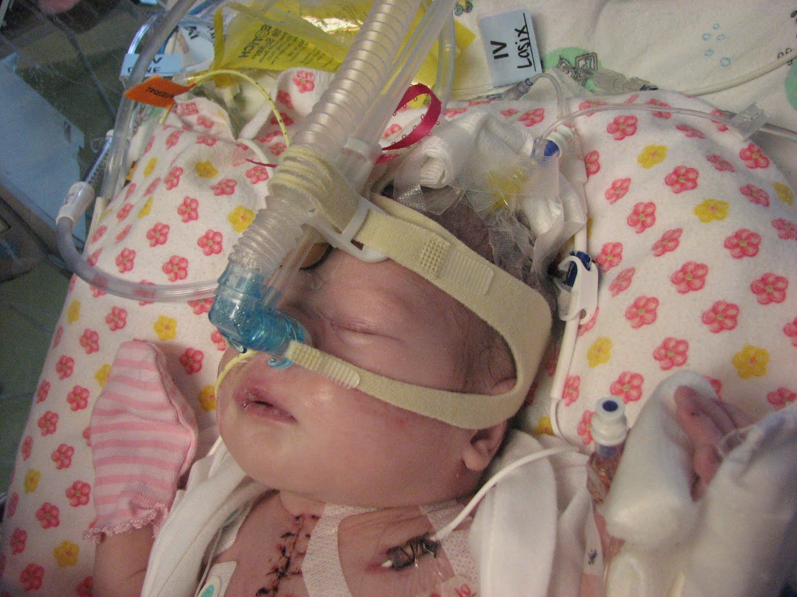 They extubated her this morning (aka took her off the ventilator) and she did FABULOUS! When they take out the tube, they do it gradually. First, they take out the tube and put her on a machine (called a CPAP) that is like this wrap around her head and this big blue thing sticking in her nose. She looks highly uncomfortable, but it’s for her own good! The next step after that is just a regular nasal oxygen tube. Usually she is on the CPAP for a day or two before graduating, but she was doing SO good at about noon that they went ahead and moved her up in advance!